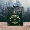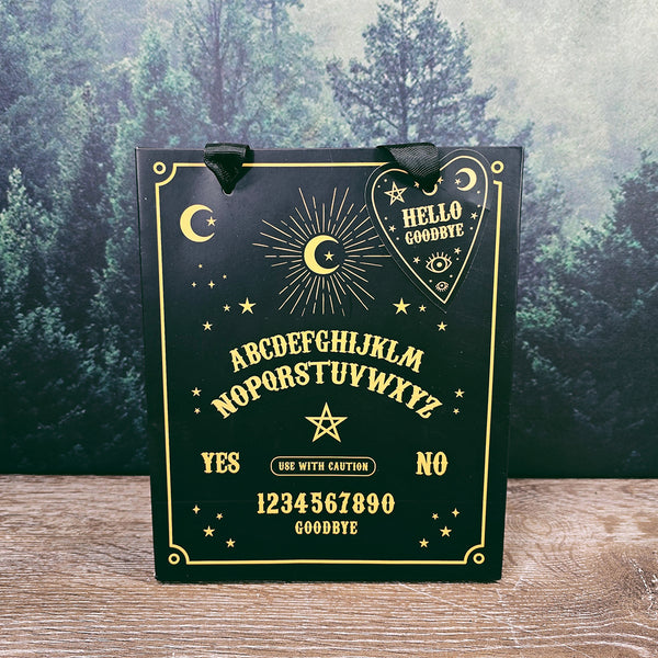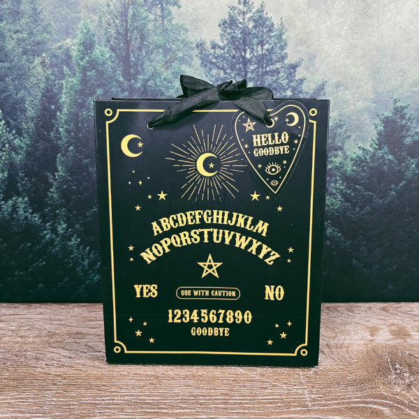Adorned with a talking board design in a premium, black and gold finish, this printed gift bag will add a touch of mystery to any gift. It stands at 23cm tall and features black ribbon handles and a blank gift tag.