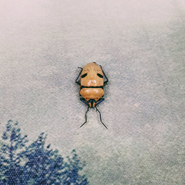This jewel stinkbug from Japan is commonly known as a Death Head Bug due to the unusual markings that appear to mimic a human face. Jewel bugs are known to mimic the colors, patterns, and shape of other organisms for defensive purposes.