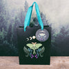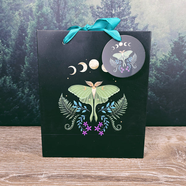 Adorned with a mystical luna moth and moon phase design, this printed gift bag will add a touch of magic to any gift. It stands at 23cm tall and features teal ribbon handles and a blank gift tag.